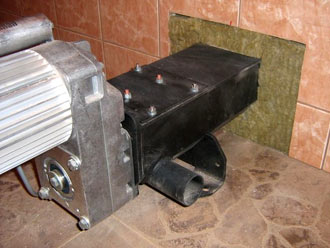 | Obr.č.5 – hnací jednotka je umístěna mimo prostor sila (většinou v kotelně), kde je spojena se šnekem v otvoru 30 x 25 cm, který musí být po instalaci protipožárně utěsněn minerální vlnou (dodávka od firmy Guntamatic se šnekem). Následně se tento detail překryje z obou stran pozinkovaným krytem dodávaným taktéž se šnekem. | Obr.č.6 – když je prostup stěnou utěsněn minerální vlnou a detail je překryt pozinkovanými plechy jak ze strany kotelny, tak ze strany sila, je možno dokončit osové i výškové vycentrování šnekového dopravníku. Nutno udělat co nejlépe, neboť šnekový dopravník je zároveň základní prvek pro založení dřevěné výdřevy sila – viz. další snímky. |