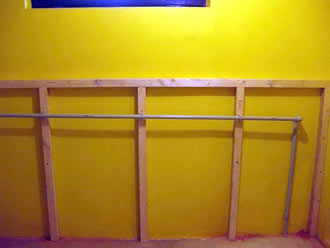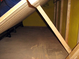 | Obr.9. – zde je již nosná konstrukce částečně nainstalována. Je provedena ze smrkových hranolů o rozměru 5x5cm. Té trubky si, prosím, nevšímejte, to je jen odpad z pračky, který touto místností prochází. | Obr.č.10 – pokud jsou šikminy sila delší než 1,5 metrů, doporučuje se je v polovině délky podepřít. Zde je podepření provedeno také z hranolků 5x5cm a ukotveno k patě svislých sloupků. |