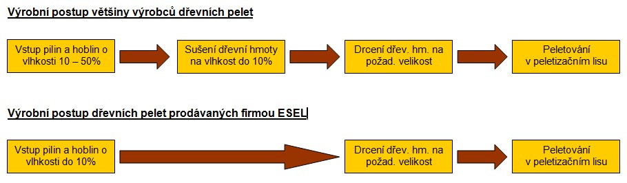 Jako nejdůležitější je to, jak je peleta vyráběna. Mnoho z Vás o tom nikdy nepřemýšlelo, ale já právě toto stavím na první místo, jako jeden z nejdůležitějších faktorů ovlivňujících výhřevnost dřevních pelet. Tímto faktorem je, zda je vstupní surovina před peletováním dosušována v sušárně, nebo není. Vždy je lepší, když je peleta vyráběna z materiálu, který má vlhkost do 10% a nemusí být před peletováním vysušován. Výjimku lze udělit sušárnám, které suší při teplotě max. do 150°C. Bohužel v ČR je jen jedna taková, která suší při teplotě 112°C, ostatní peletárny suší vstupní surovinu při teplotách 200°C až 550°C a to je pro peletu vyrobenou z takové suroviny velmi špatné. Taková peleta nikdy nedosáhne ve výhřevnosti pelety, která byla vyrobená ze suché suroviny s vlhkostí do 10%, popř. ze suroviny, která byla dosušována při teplotě max. do 150°C.