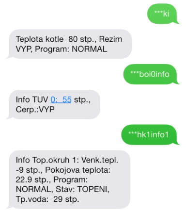Celé to funguje velmi jednoduše. Příkazy jsou odesílány jako SMS z mobilního telefonu do modulu GSM a následně předávány z modulu GSM do řídicí jednotky. Příkazy lze psát velkými nebo malými písmeny. Na každý příkaz se zpátky na uložené telefonní číslo provozovatele posílá potvrzení o provedení povelu opět pomocí SMS. Pokud je GSM komunikátor nainstalován na kotli Biocom, Powercorn, Powerchip nebo PRO, jsou informace posílány na dvě telefonní čísla. Příkazy je možno zasílat z jekéhokoliv telefonního čísla, odpověd na příkaz přijde vždy jen tomu, kdo je nastaven v řídící jednotce kotle. GSM komunikátor dokonce umí i prostřednictvím SMS zprávy změnit telefonní číslo příjemce zpráv v kotli, bez toho aniž by bylo potřeba být v osobním kontaktu s kotlem.